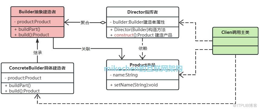 Product(产品类) :具体需要生成的类对象; Builder(抽象建造者类):为我们需要生成的类对象,构建不同的模块属性,即:公开构建产品类的属性,隐藏产品类的其他功能; ConcreteBuilder(具体建造者类):抽象 Builder 类的实现类,实现抽象 Builder 类定义的所有方法,并且返回一个组建好的对象; Director(指挥者类):用于统一组装流程,确定构建我们的类对象具体有哪些模块属性,在实际应用中可以不需要这个角色,直接通过 client 处理。