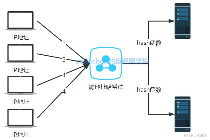 根据服务消费者请求客户端的IP地址,通过哈希函数计算得到一个哈希值,将此哈希值和服务器列表的大小进行取模运算,得到的结果便是要访问的服务器地址的序号。