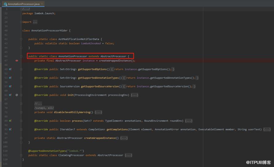 AnnotationProcessorHider 这个类里面有两行静态内部类,我们看其中一个, AnnotationProcessor ,它是继承自 AbstractProcessor 抽象类: