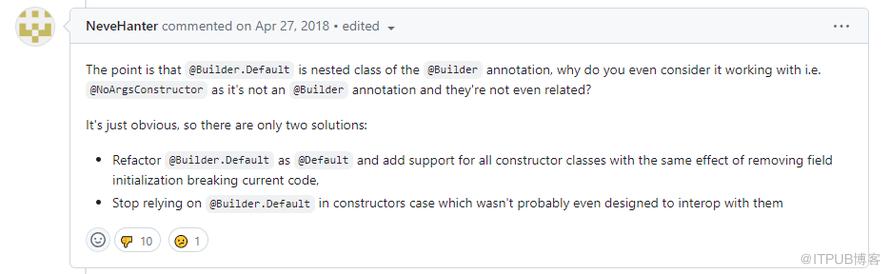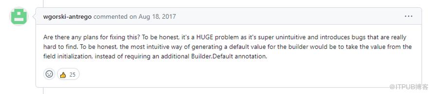 同时他还抛出了一个观点:老实说,为字段生成默认值的最直观方法就是从字段初始化中获取值,而不是需要额外的 Builder.Default 注解来标记。
