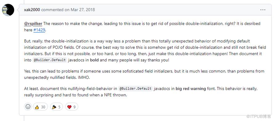 他说,导致这个问题的原因是为了消除可能出现的重复初始化。但实际上,与修改 POJO 字段的默认初始化这种完全出乎意料的行为相比,重复初始化的问题要小得多。