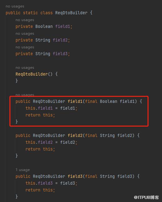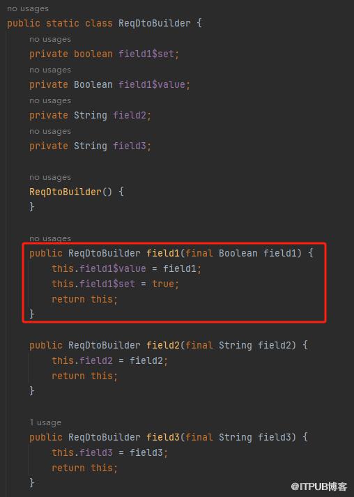 没有@Builder.Default 注解的时候,class 文件中 ReqDtoBuilder 类中关于 field1 字段是这样的: