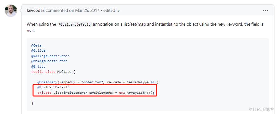虽然我没有找到关于 @Builder.Default 注解存在的意义的官方说明,但是我在 github 上找到了这个一个链接: