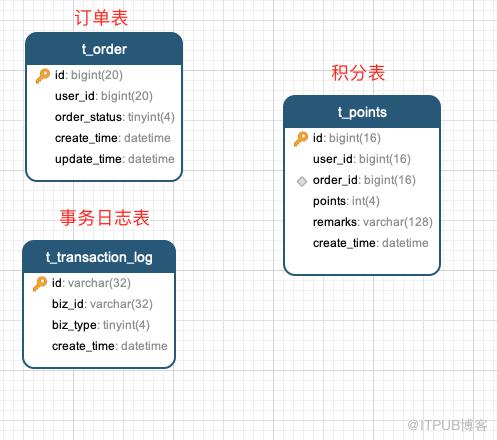 然后在数据库中创建三张表 订单表、事务日志表、积分表。