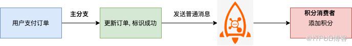用户购物车结算时,系统创建支付订单; 支付成功后,更新订单的状态从未支付修改为支付成功; 发送一条普通消息到消息队列服务端; 积分服务消费消息,添加积分记录。
