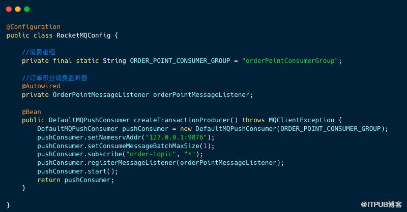 积分消费者服务,我们定义了消费者组名,以及订阅主题和消费监听器。