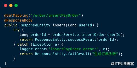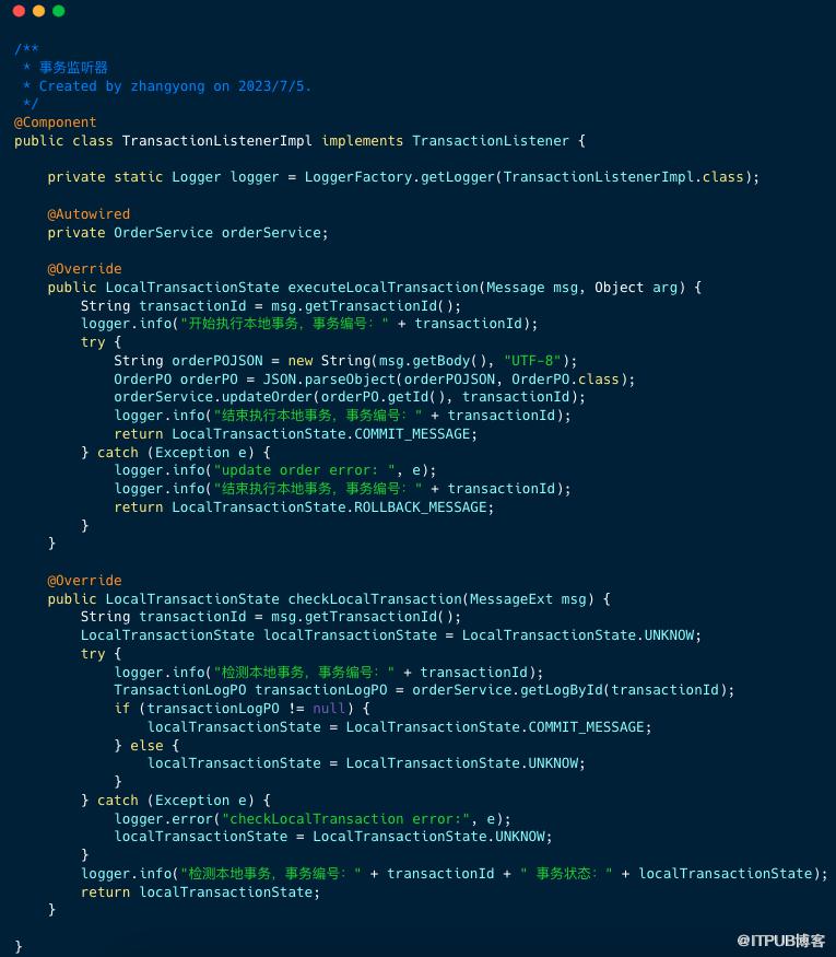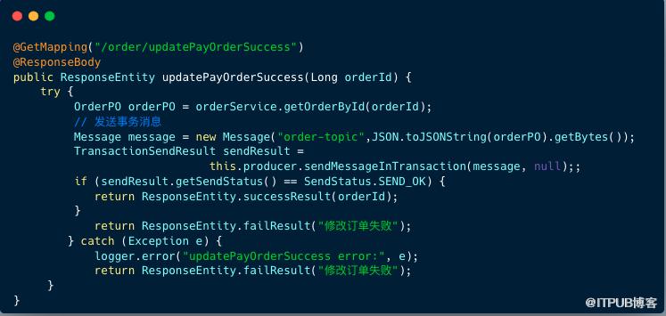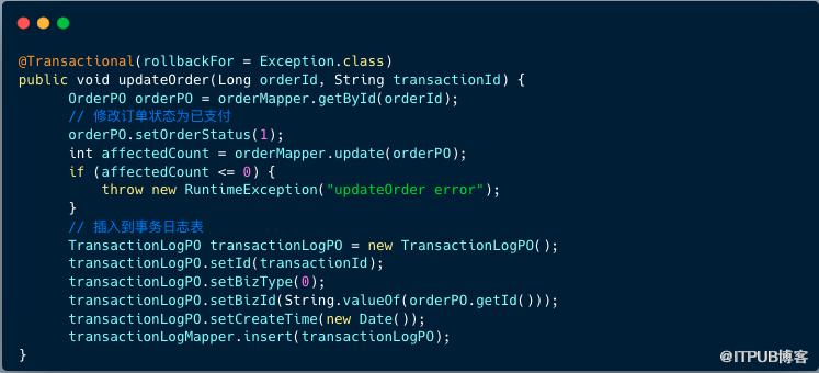 需要注意的是: orderService.updateOrder 方法添加了事务注解,并将修改订单状态和插入事务日志表放进一个事务内,避免订单状态和事务日志表的数据不一致。