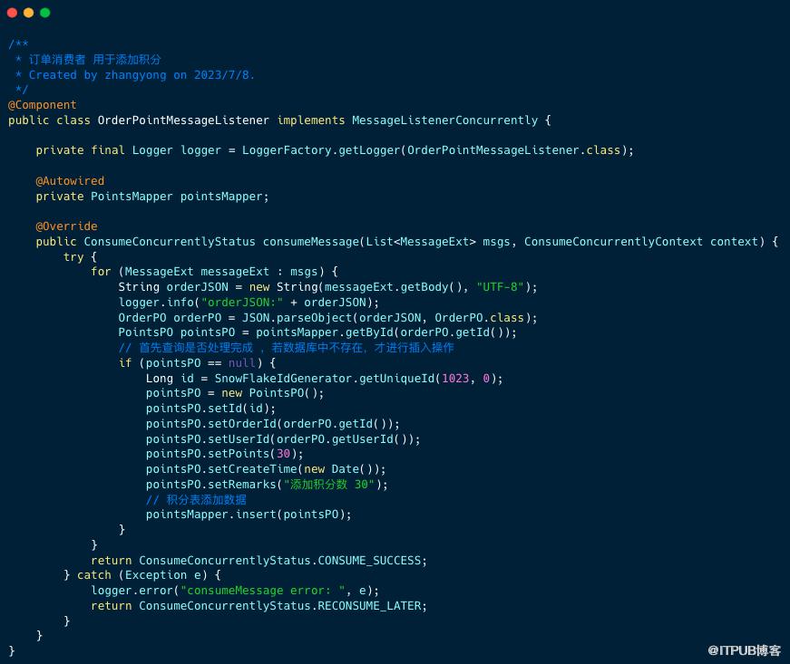 在消费监听器逻辑里,幂等非常重要 。当收到订单信息后,首先判断该订单是否有积分记录,若没有记录,才插入积分记录。
