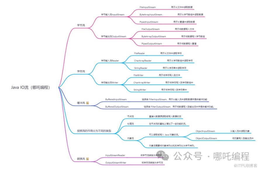 InputStream 代表一个输入流,它是一个抽象类,不能被实例化。InputStream 定义了一些通用方法,如 read() 和 skip() 等,用于从输入流中读取数据; OutputStream 代表一个输出流,它也是一个抽象类,不能被实例化。OutputStream 定义了一些通用方法,如 write() 和 flush() 等,用于向输出流中写入数据; 除了字节流,Java 还提供字符流,字符流类似于字节流,不同之处在于字符流是按字符读写数据,而不是按字节。Java 中最基本的字符流是 Reader 和 Writer,它们是基于 InputStream 和 OutputStream 的转换类,用于完成字节流与字符流之间的转换。 BufferedInputStream 和 BufferedOutputStream 是 I/O 包中提供的缓冲输入输出流。它们可以提高 I/O 操作的效率,具有较好的缓存机制,能够减少磁盘操作,缩短文件传输时间。使用 BufferedInputStream 和 BufferedOutputStream 进行读取和写入时,Java 会自动调整缓冲区的大小,使其能够适应不同的数据传输速度。 可以读取或写入 Java 对象的流,比较典型的对象流包括ObjectInputStream 和 ObjectOutputStream,将 Java 对象转换为字节流进行传输或存储;
