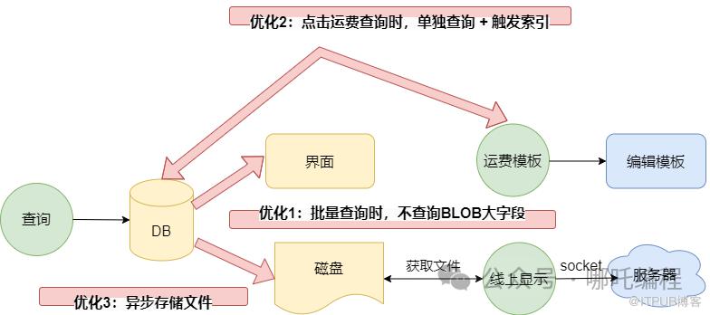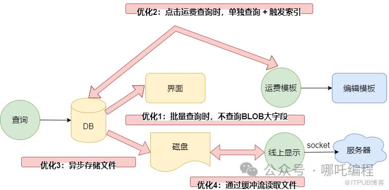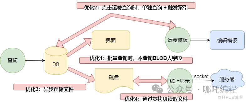 批量查询时,不查询BLOB大字段; 点击运费查询时,单独查询+触发索引,实现“懒加载”; 异步存储文件 通过 缓冲流 -> 内存映射技术mmap -> sendFile零拷贝 读取本地文件;