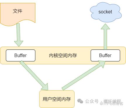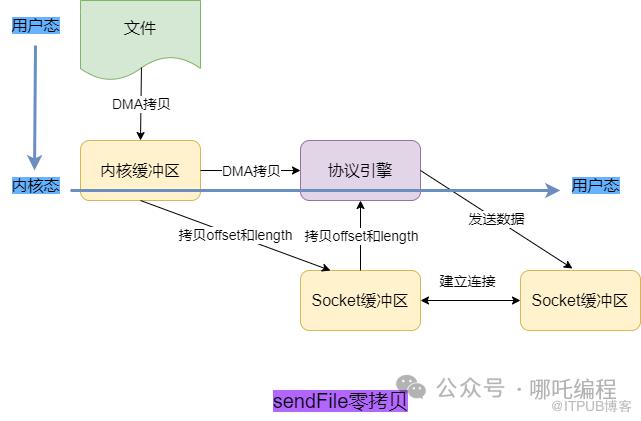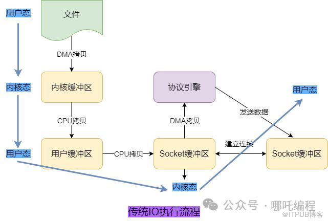 磁盘文件 DMA 拷贝到内核缓冲区 内核缓冲区 CPU 拷贝到用户缓冲区 用户缓冲区 CPU 拷贝到 Socket 缓冲区 Socket 缓冲区 DMA 拷贝到协议引擎。