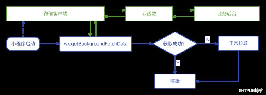 { "lazyCodeLoading": "requiredComponents"}「按需注入」启用后,小程序仅注入当前访问页面所需的自定义组件和页面代码。未访问的页面、当前页面未声明的自定义组件不会被加载和初始化,对应代码文件将不被执行,以降低小程序的启动时间和运行时内存。值得注意的是,插件包和扩展库目前暂不支持按需注入。如果需要实现插件按需加载,可以考虑将插件置于一个分包,并通过「分包异步化」的形式异步引入。在小程序的启动过程中,会进行代码初始化并依次同步执行 App.onLaunch, App.onShow, Page.onLoad, Page.onShow 等生命周期函数,在此期间应尽量减少或不调用同步API。1、getSystemInfo/getSystemInfoSync,可尝试使用异步版本API getSystemInfoAsync代替;2、getStorageSync/setStorageSync,应只用来进行数据的持久化存储,不应用于运行时的数据传递或全局状态管理。页面首屏渲染的优化,旨在让用户更早的看到有内容的页面绘制(FCP)或者有意义的页面绘制(FMP)。在页面渲染阶段是,会初始化读取当前页面配置和全局配置中使用 usingComponents 引用的自定义组件,以及组件所依赖的其他自定义组件,引入未使用的自定义组件会影响页面初始化渲染耗时。因此,当组件不被使用时,应及时从 usingComponents 中移除。页面首次渲染的耗时与页面的复杂程度呈正相关。在京购小程序很多业务场景当中,小程序渲染的页面高度是超过一屏的,但在用户首次进入页面时,超出屏幕的页面内容并没有实际性的意义,因此只需要优先渲染出可视范围内的内容即可。当页面首屏渲染完毕后,再继续异步渲染剩下的页面内容。1、如果页面从上到下是由多个独立的组件组合而成的,那么可以针对不在首屏范围内的组件进行延迟加载;2、如果页面是由某个列表项展开构成的,例如首页的feeds流,那么可以通过主动控制列表项的长度进行分页加载,在滑动至接近于底部时再进行更多列表项的加载和渲染。需要注意的是,与页面渲染无关的数据尽量不放在data当中,避免影响页面渲染耗时。由于网络请求都需要一定的时间,但小程序页面渲染的数据却经常需要依赖服务端的接口返回,在服务端接口返回数据之前页面就可能是空白的或者骨架屏。为了尽可能早发出核心数据请求,可以采用微信小程序提供的能力:数据预拉取。「数据预拉取」使得可以在小程序启动时,由微信客户端通过微信后台提前向服务器拉取核心业务数据,当代码包加载完成时,在京购首页通过 wx.getBackgroundFetchData 拿到预拉取的数据,便可以更快地渲染出首页,减少用户等待时间,具体核心流程如图所示: