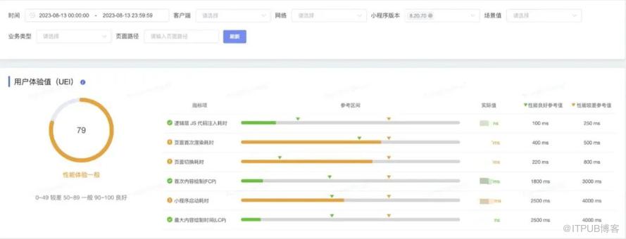 烛龙监控平台根据以上几个指标权重和每个指标分值加权平均,计算用户体验值评分(UEI),如图: