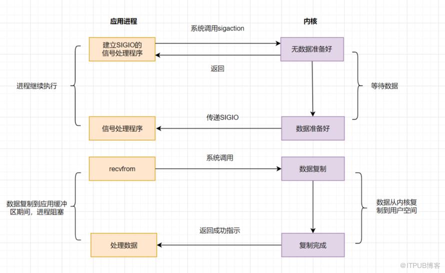 信号通知应用进程,数据准备好后的可读状态。应用用户进程收到信号之后,立即调用recvfrom