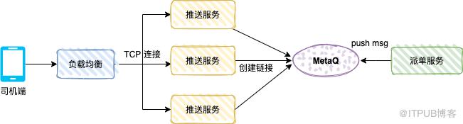 派单服务是生产者,将派单数据发送到 MetaQ , 每个推送服务都会消费到该消息,推送服务判断本地内存中是否存在该司机的 TCP channel , 若存在,则通过 TCP 连接将数据推送给司机端。