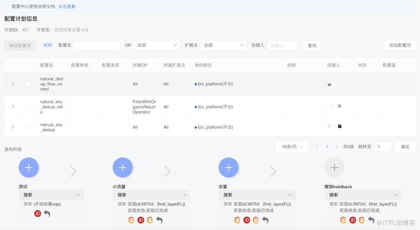 「全新视角配置建模」跳出通用的KV建模,京东提出基于全新视角业务配置三要素建模:配置项(Key),配置条件(Condition),配置值(Value)。较KV配置组件,京东的新配置组件更加灵活,定制化能力更强大:以推荐出价OP为例,使用时只需要配置该Key作用于出价OP,配置Condition为推荐业务,配置Value为1。在全新视角配置下,配置Key从属于一个算子OP,配置Condition可做流量业务身份的定制扩展,可以随着业务不断发展迭代。配置方式具有业务语义,便于理解。「任意配置均可一键实验」上述所有配置更改皆可一键AB分层实验,为在线系统提供超大实验容量。在线广告的配置系统联动分层实验平台,每个算子具备20+个分层实验同时运行的能力。京东广告日常的实验容量在400以上,理论上分层实验可以容纳无限的实验容量,足够满足超300人的产研团队的日常迭代需求。配置修改可叠加一键发起实验,极大简化了研发人员的配置开发测试负担,使得实验切换方式更加灵活可控。「一站式配置管理及发布」通常业务逻辑迭代需要充分了解当前的配置状态,将全部配置在统一管理界面中呈现,一方面提高了统一配置管理的便捷程度,同时让配置具有更优的可阅读性,让不具备开发能力的同事可以随时了解广告检索系统的业务处理流程,并进行一键实验操作。同时一站式的配置修改,贯穿于自测、联调测试、小流量、全量、holdback研发周期的全程跟踪和托管,免除了在多个平台切换的烦恼。