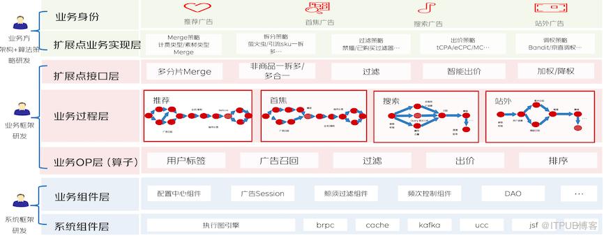 「业务系统分层」把在线系统分为系统架构层、业务框架层及业务算法策略定制层,三层迭代相互独立。这样让业务研发专注于业务逻辑编排及策略本身,而系统研发专注于基础架构的优化。
