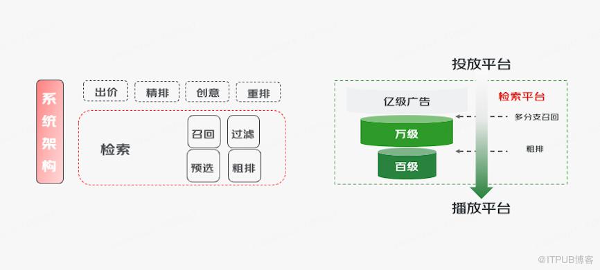 检索平台将广告主投放诉求转换为播放系统的语言;同时,作为广告系统的最上游,完成人货场的初步匹配。从上亿级的检索空间,返回数百个物料发送至下游,需要考虑用户体感、广告主的投放诉求、召回结果的相关性、平台收入等,承载了大部分的广告业务逻辑。其效果决定了整个广告效果的天花板。