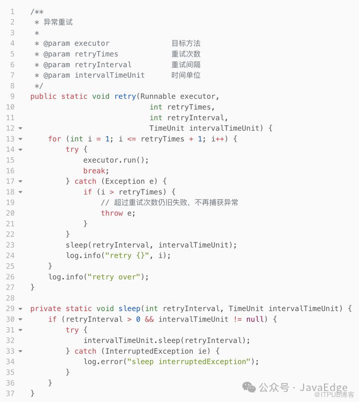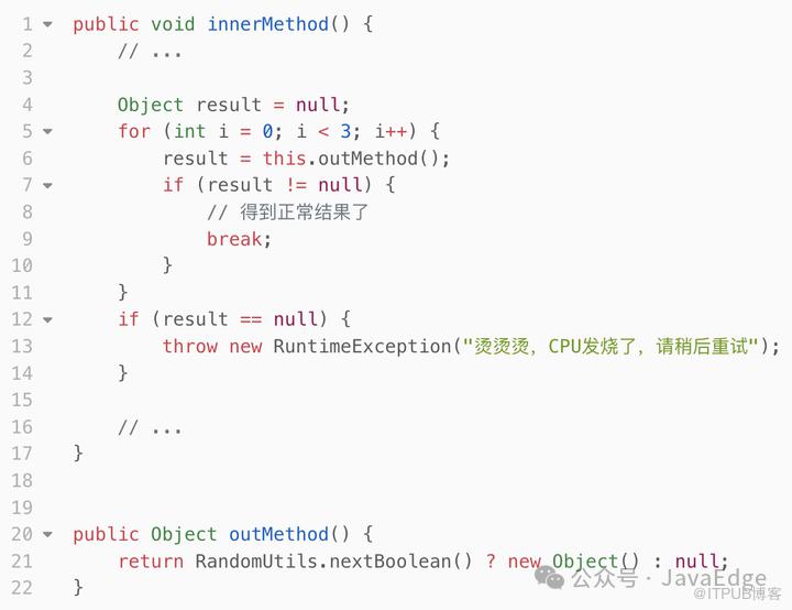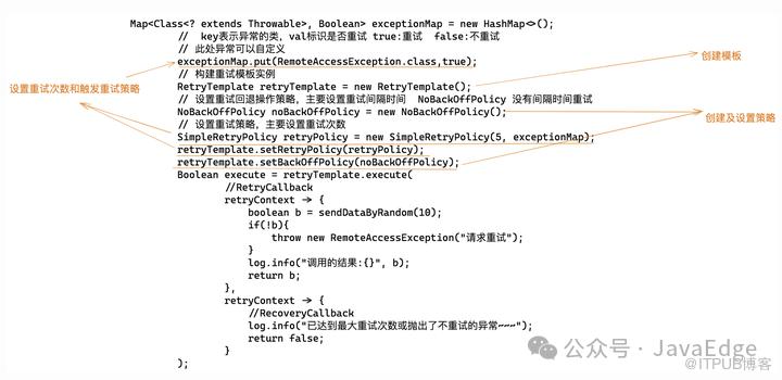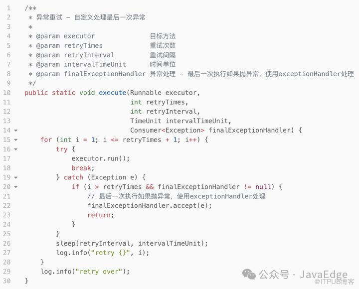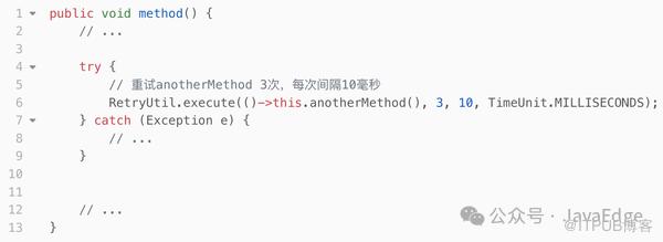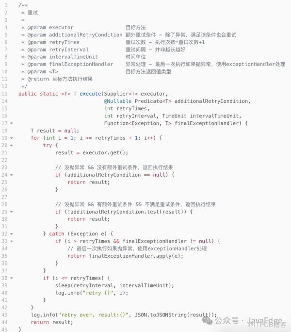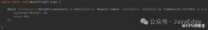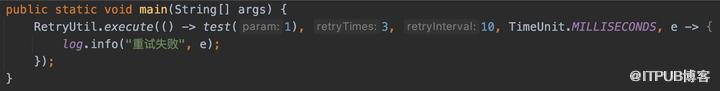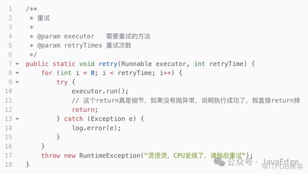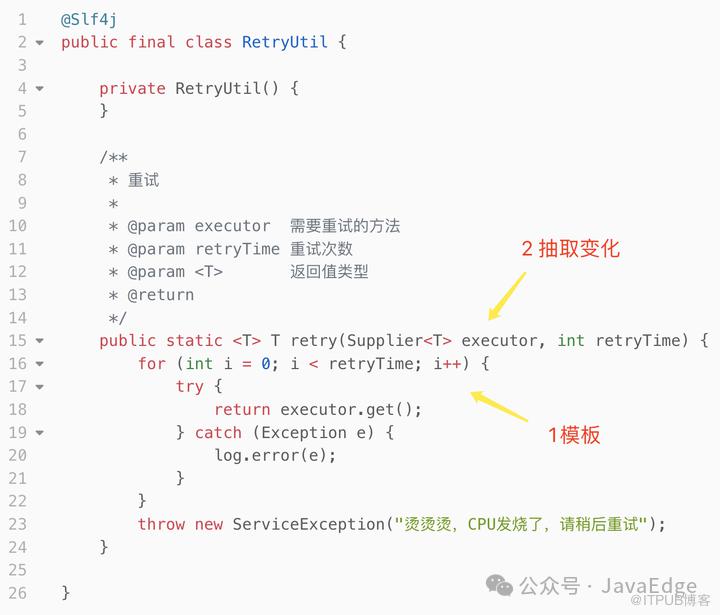 首先,确定要用函数式接口+[泛型]。使用泛型是看重其代码模板能力,如重试代码中都有for循环,就可抽取为模板。[函数式接口]可很方便地把代码中变化的部分和稳定的部分剥离开,如需要重试的方法都是不同的,可以通过函数式接口剥离出去: