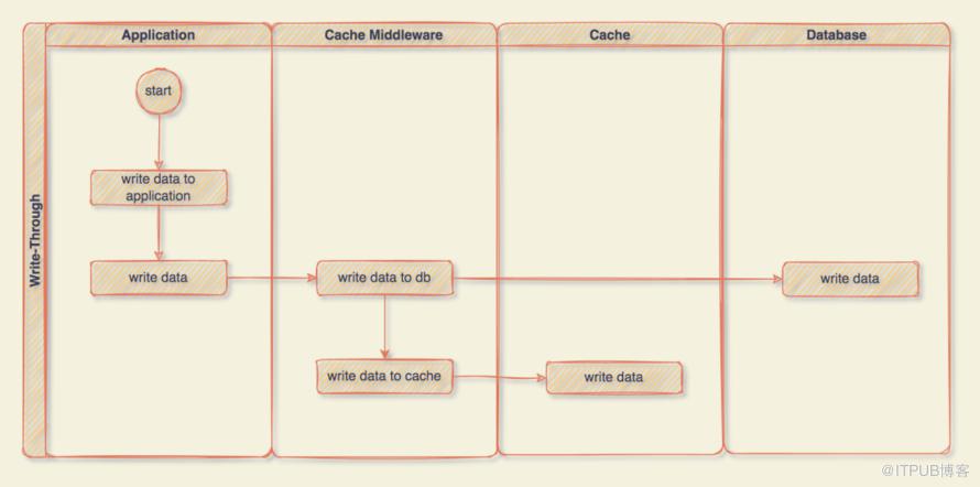 Write-Through 其实也是差不多,所有的操作都交给 Cache Middleware 来完成,应用程序中就是一句简单的更新就行了,我们来看看流程:
