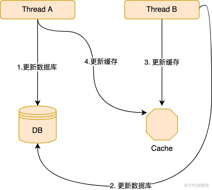 首先 A 线程更新了数据库。 接下来 B 线程更新了数据库。 由于网络等原因,B 线程先更新了缓存。 A 线程更新了缓存。