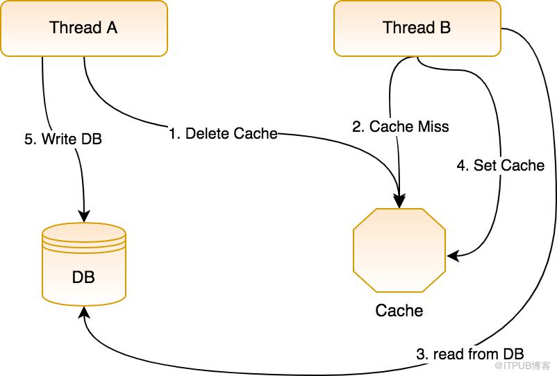 A 线程首先删除缓存。 B 线程读取缓存,发现缓存中没有数据。 B 线程读取数据库。 B 线程将从数据库中读取到的数据写入缓存。 A 线程更新数据库。