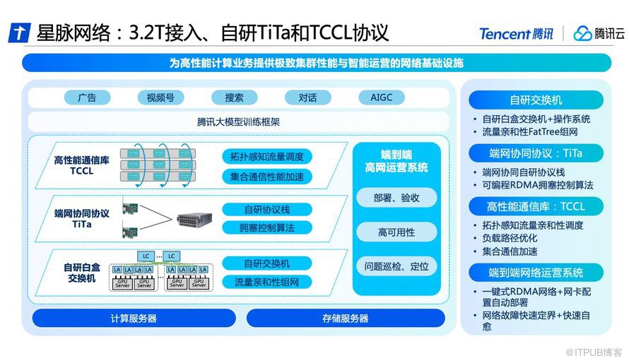 星脉网络采用了多个自研“绝活儿”。首先,星脉网络采用的自研端网协同协议TiTa,提供更高的网络通信性能,特别是在满足大规模参数模型训练的需求方面。TiTa协议内嵌拥塞控制算法,以实时监控网络状态并进行通信优化,使得数据传输更加流畅且延迟降低。其次是开发了高性能集合通信库TCCL、以及多轨道流量聚合架构、异构自适应网络通信等,以协调计算资源和网络资源,充分利用计算节点间通信与处理能力,改善整个系统的性能和计算效率。