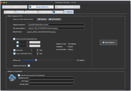 流量捕获可在 ProfiShark 管理器中启动,PCAP 捕获文件可直接保存在用户定义的特定文件夹中。还可进行环形缓冲、分割或停止特定大小和文件。