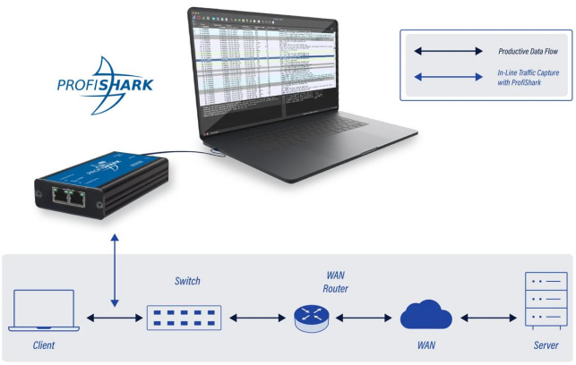 这种专用 TAP 可以处理大量网络流量,而不会影响系统资源,因此适用于高速网络。它通过硬件时间戳和附加型号上的 GPS 接收器提供高精度。故障排除人员可以看到整个帧的传输过程,因此甚至可以检测到帧中的 CRC 故障。ProfiShark 管理器可以捕获流量,而无需依赖分析软件。
