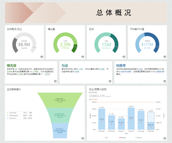 下面是使用Domo进行数据分析的部分效果展示,分别涵盖了总体概况、曝光量、互动效果以及转换率。