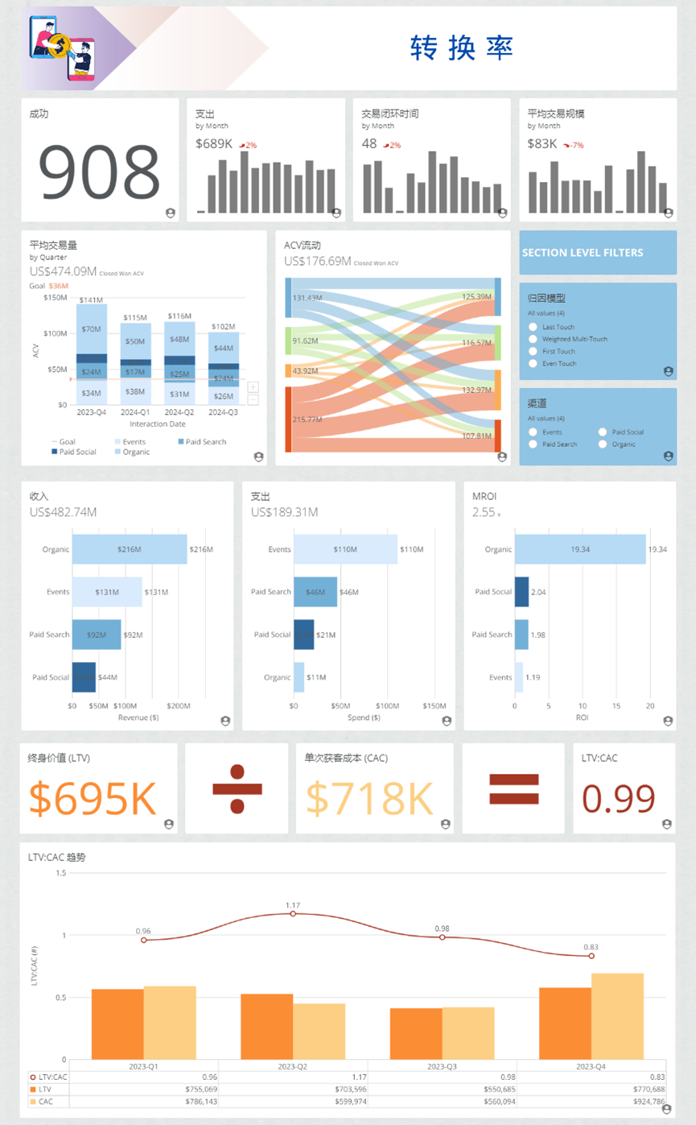 轻松实现广告收入、支出、 ROI 数据集成展示;同时 Domo 支持归因模型、渠道切换