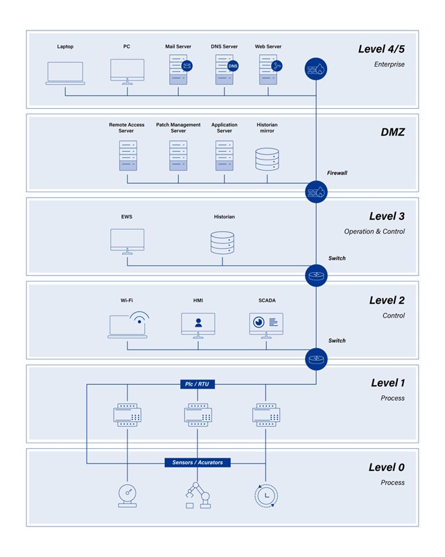 普渡工业控制系统(ICS)安全模型是一个框架,概述了保护敏感工业环境的多层次方法。该模型最初由普渡大学开发,并作为ISA-99标准的一部分由国际自动化学会(ISA)进一步完善,它定义了六个不同的网络分段层,每个层都旨在发挥保护和管理工业运行的特定功能。这些层级的范围从企业级一直到实际物理流程。