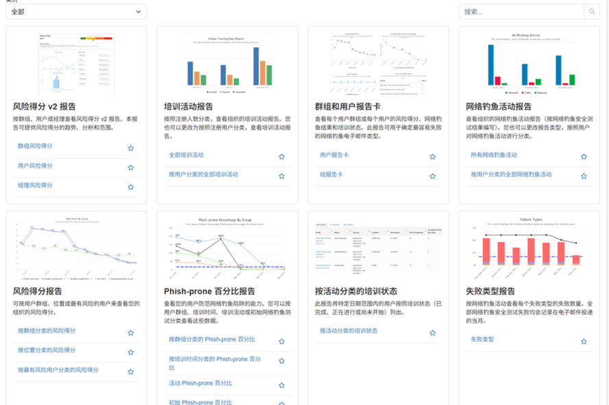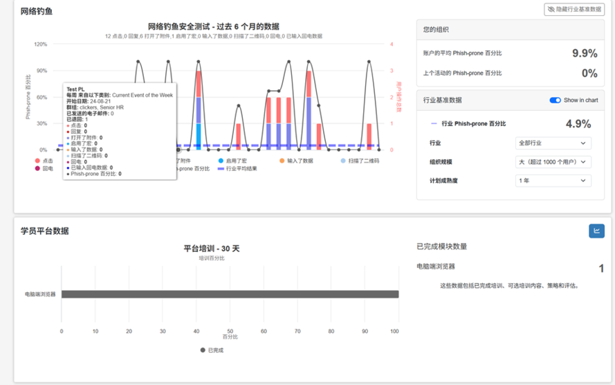 l 提供详细报告,展示安全意识培训和网络钓鱼的统计数据和图表,帮助企业了解安全意识薄弱点并针对性改进。