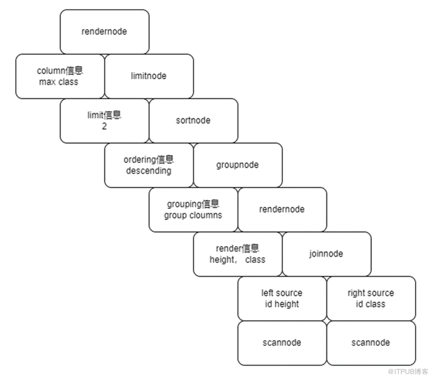 其上层的 renderNode 会对这张虚拟表进行查询,筛选出 height 列和 class 列,groupNode 会对 class 列进行 group 处理,并对 class 作 max 聚合。然后, sortNode 对 groupNode 处理过的 max 聚合结果进行排序,limitNode 对结果作相应的操作。最后,最上层的 renderNode 对结果进行查询,筛选出 max(height) 列和 class 列。以上即为该 PlanNode 的详细信息。