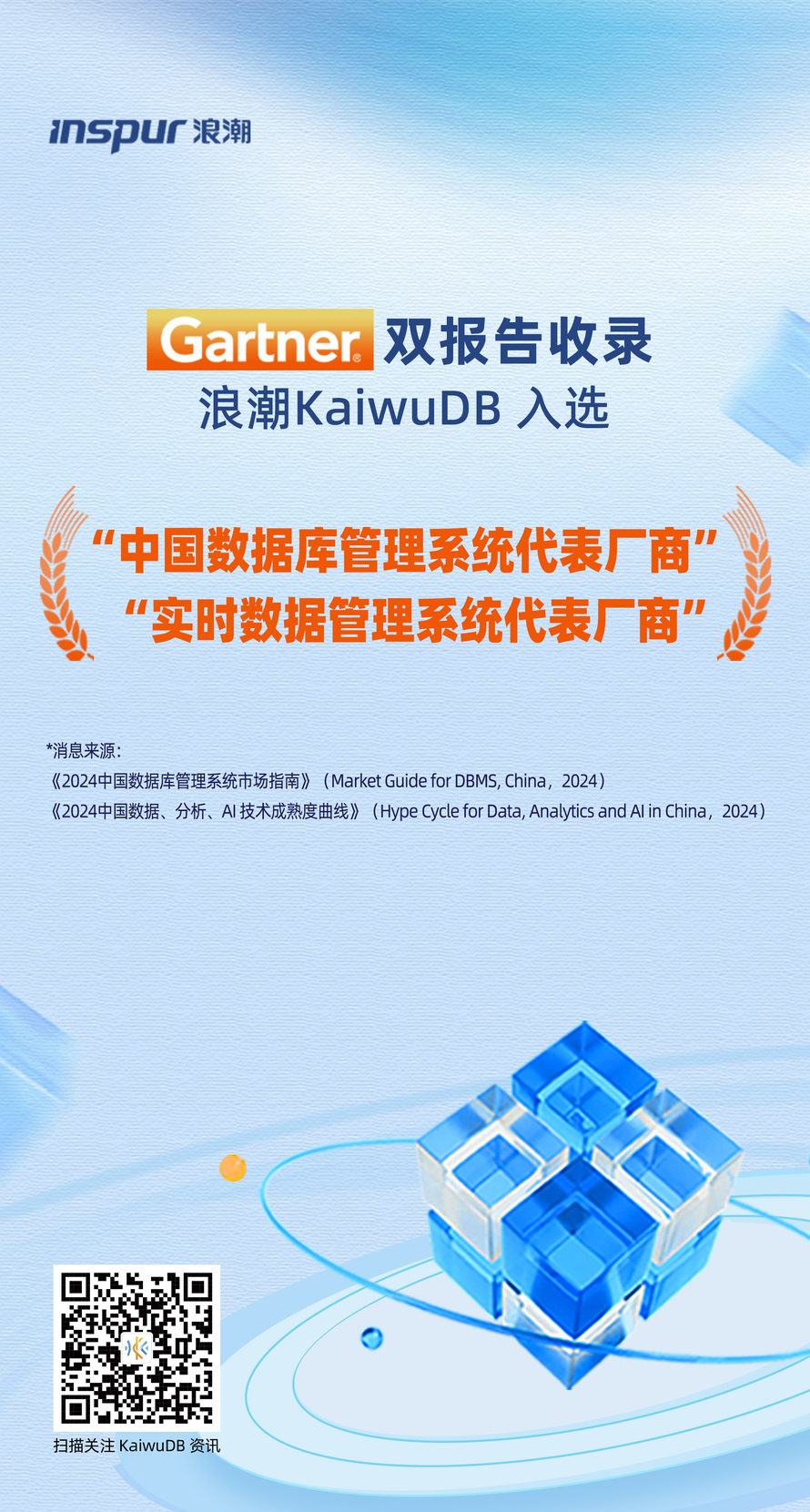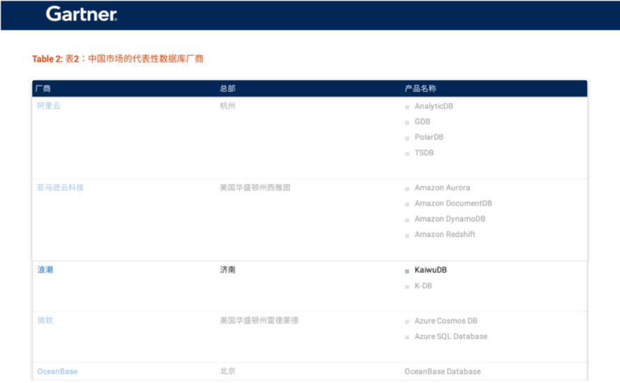 2024年末,国际权威 IT 研究与咨询顾问机构高德纳(Gartner)发布《中国数据库管理系统市场指南》(Market Guide for DBMS, China)报告中,浪潮KaiwuDB 作为中国数据库管理系统领域代表厂商入选该报告,其创新研发的分布式多模数据库系统 KaiwuDB 入选典型产品。