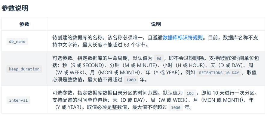 CREATE TS DATABASE  [RETENTIONS ] [PARTITION INTERVAL ];