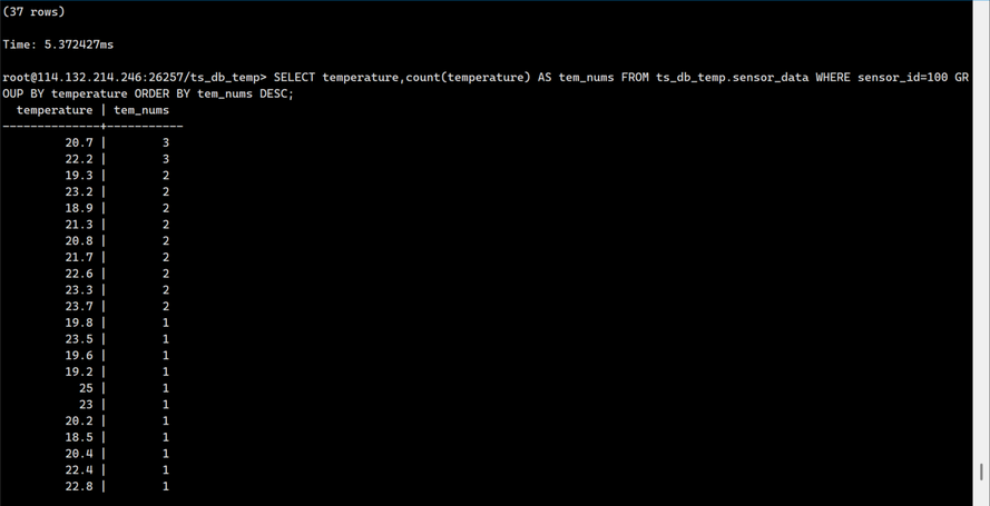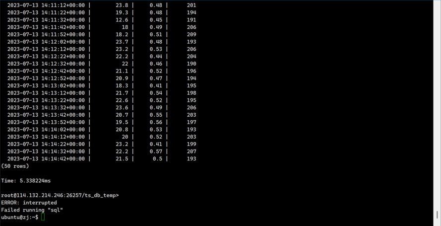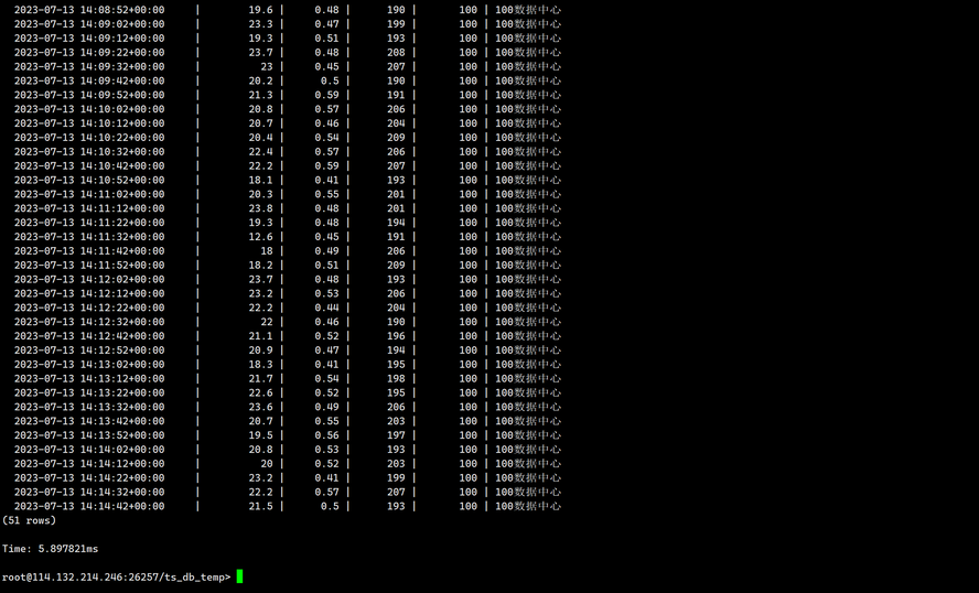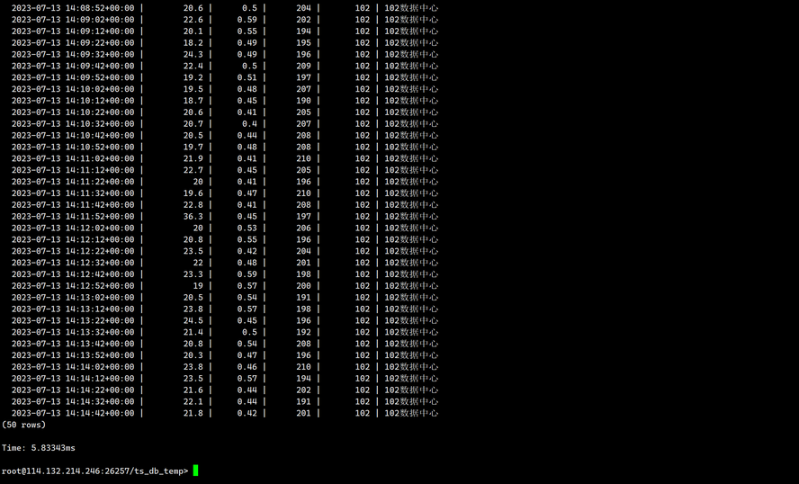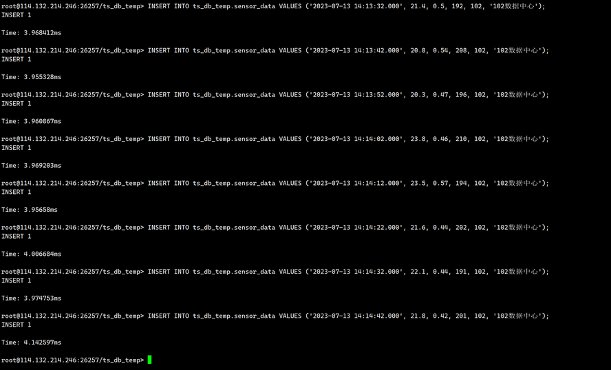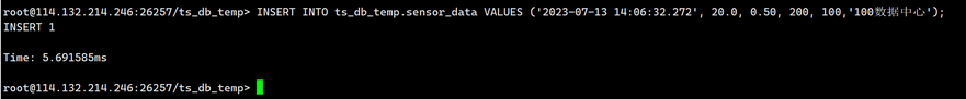 INSERT INTO ts_db_temp. sensor_data VALUES ('2023-07-13 14:06:32.272', 20.0, 0.50, 200, 100,'100数据中心');