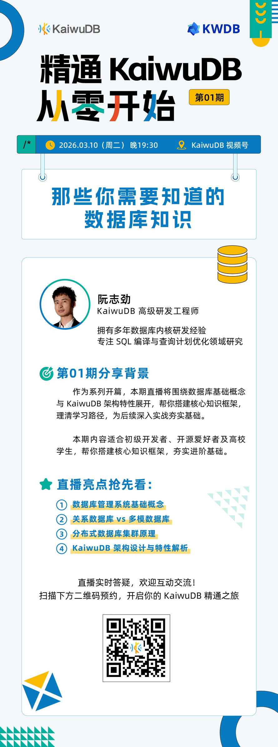 「从零开始精通 KaiwuDB」是一套由 KaiwuDB 资深研发工程师主讲,面向所有数据库开发者、DBA、技术爱好者的系统化进阶课。 从 基础理论 到 架构特性 ,从 安装部署 到 深度应用 ,层层拆解,实战演练,带你稳步迈向数据库专家之路~