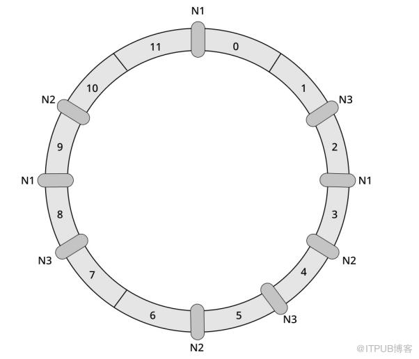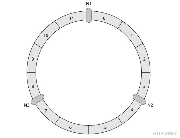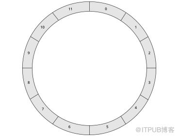 一致性哈希算法将整个哈希值组织成一个抽象的圆环,称为哈希环(Hashing Ring)。哈希函数的输出值一般在0到INT_MAX(通常为232-1)之间,这些输出值可以均匀地映射到哈希环边上。举个例子,假设哈希函数hash()的输出值大于/等于0小于/等于11,那么整个哈希环看起来如图4所示。