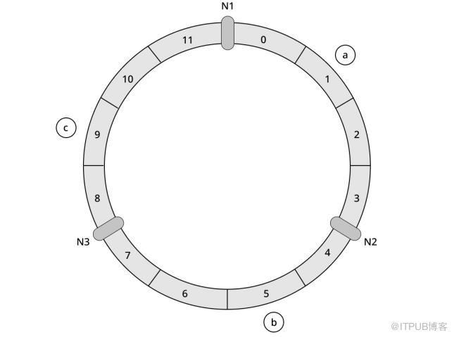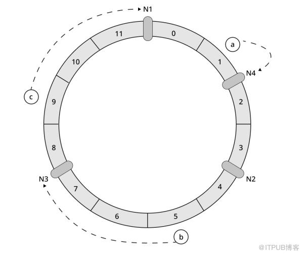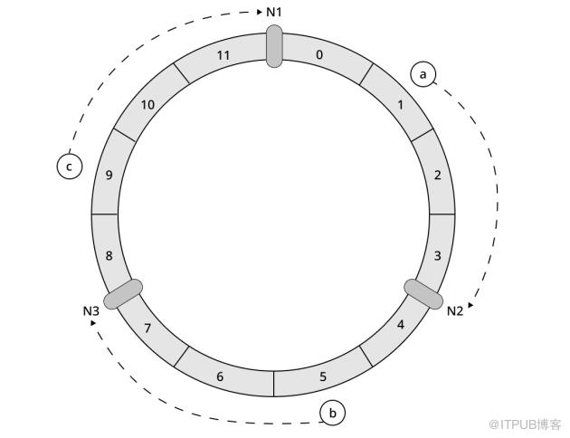 在一致性哈希算法中,数据存储在按照顺时针方向遇到的第一个节点上。例如图6中,关键字a顺时针方向遇到的第一个节点是N2,所以a存储在节点N2上;同理,关键字b存储在节点N3上,关键字c存储在节点N1上。数据分布方法如图7所示。