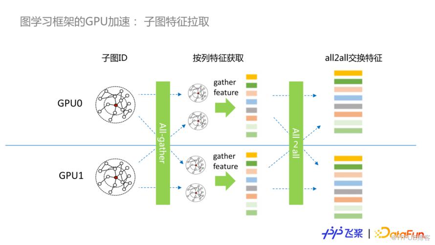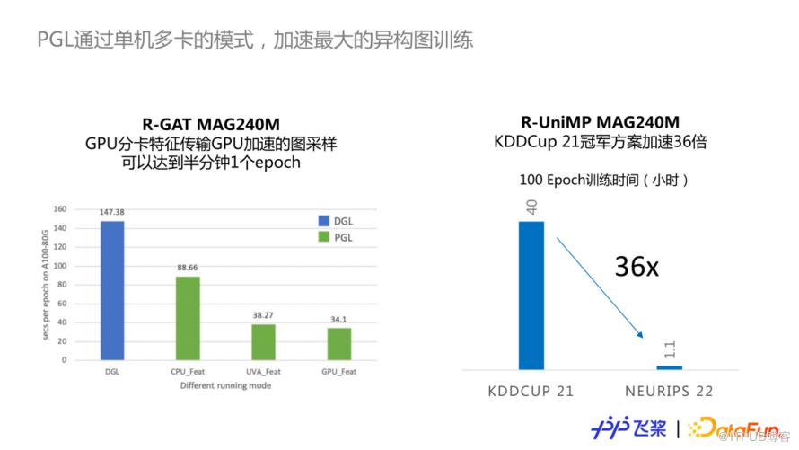 在实际的训练里面,我这里用两个 GPU 来举例子,当我们在做数据并行的时候,每个 GPU 只是负责某一部分节点的训练,采样它子图 ID 的时候,我们可以按列用一次的 All-gather,把所有的点对应的一块子图,全部通过 All-gather 获取,然后在局部的按列切分的特征上面把一些 feature 获取。获取之后再通过 All2all 去交换特征,把整个图的结构特征还原。通过这样的 All2all 把整个特征切分,用 GPU 做传输,我们目前可以把 R-GAT 在 MAG240 上面半分钟就可以训完一个 epoch 了,相比之前的相对于 CPU 的或者说 DGL 的那种也是 CPU 模式的速度会更快。