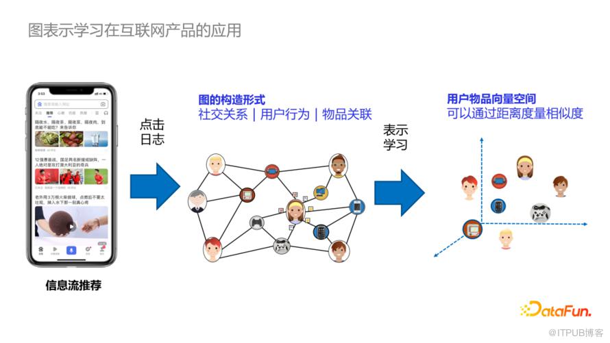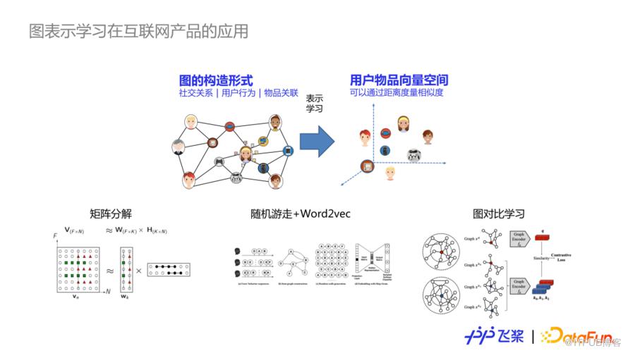 通常图学习在互联网里面的一些应用大部分都是基于这样的情况,就是我们会在海量的日志里面用户以及物品构造一张很大的图,包括有社会的关系、用户的一些行为以及物品的一些关联。我们通过这些图表示学习的一些方法对每个点给一个向量,在这个向量空间里面可以用距离去度量,就是不同的物品以及用户之间的一些相似度。