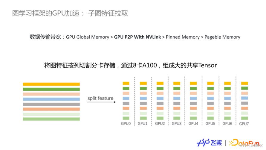 这里我们针对图里面最大的一块特征按列切割的形式进行分卡的存储。例如我们左边的这里有一个 300G 的图特征的存储,我们把它切到每一张卡,大概每一张卡是 40G 的显存消耗。那么我们就可以把一整个 MAG240 加上图结构在 8 个 A100 上面存储,组成了一个很大的共享的 Tensor。