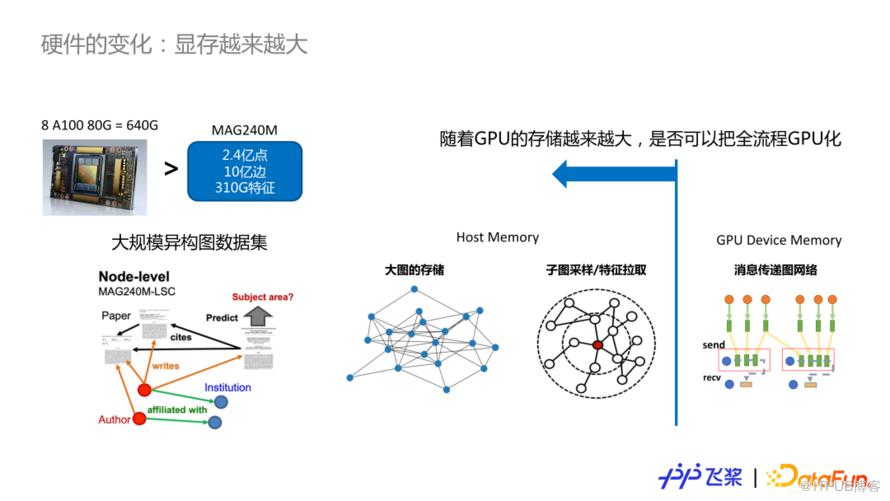 随着硬件的逐渐地发展,我们也会发现一个趋势,就是现在的显存越来越大,包括是 8 块的 A100 的 80G 我们能在单台机器上组到一个 640g 的显存。那么这是一个什么样的概念?我举一个例子,就是现有的最大的一个异构图的数据集,Open Graph Benchmark 里面最大的一张图是叫 MAG240M,里面是一些论文作者引用网络,大概是 2 亿的点 10 亿的边。它里面最大的东西是 310G 的特征,就是使用 BERT 抽取的文本特征,每个文本拥有 768 维,这里有大概 300 多 G 特征。但是在这么大的情况下,我们的 A100 80g,如果我们把 8 个卡拼在一起,已经能超过这么一个数据集的容量了。那么我们是不是可以做这样的一个事情?就是 GPU 存储这么大,我们是不是可以把我们整个图算法的流程完全地 GPU 化满足大部分的场景。因此我们也在想怎么对我们图学习的框架进行 GPU 的加速。