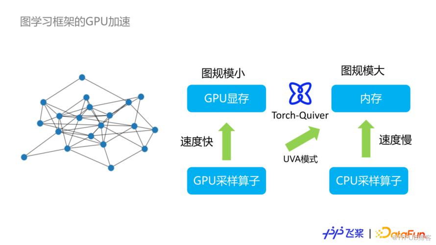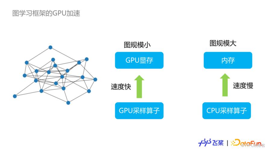 说到加速的话,因为大图很难实现。那我们先把概念转到图很小的情况下,我们会怎么做?在图很小的情况下,一个很直接的办法就是我们把图的结构完全的塞到显存里面去。再通过在显存里面实现的一些图采样的算子,那么就可以把我们在图学习算法里面的图存储以及采样的数据流全部的挪到我们的 GPU 上面去,就可以达到很极致的速度。但是这里最大的问题就是实际上在做的时候,我们的图还是挺大的。如果是大概 200G 的一个图结构,一个单卡的 GPU 已经做不到了。