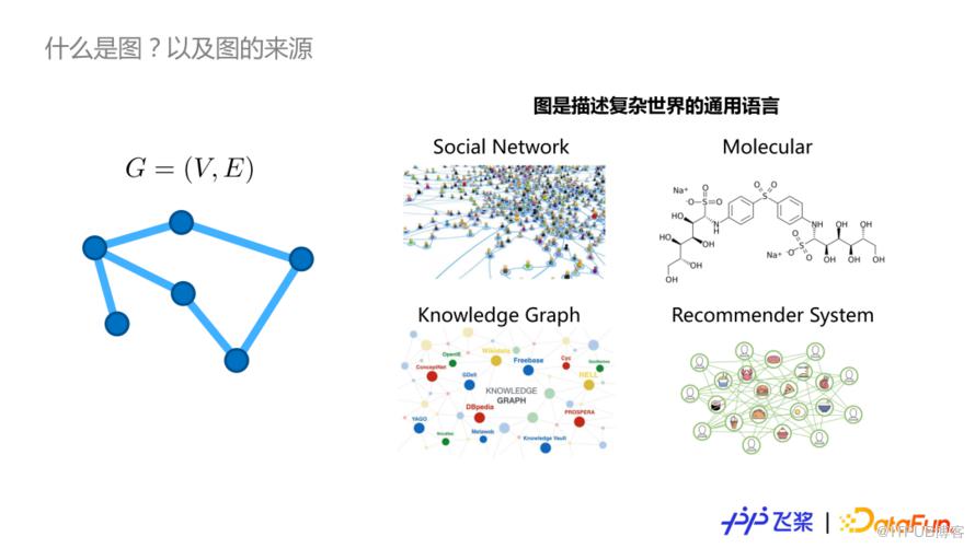 首先图是描述复杂世界的一个通用语言。包括我们在互联网里面的一些像社交网络,它是人和人之间的连接。以及近期一些比较火热的像生物计算的一些领域,它是一些化学分子的图的结构。以及像知识图谱,它是一些实体与关系的连接。推荐系统是用户与物品之间的一些关联。