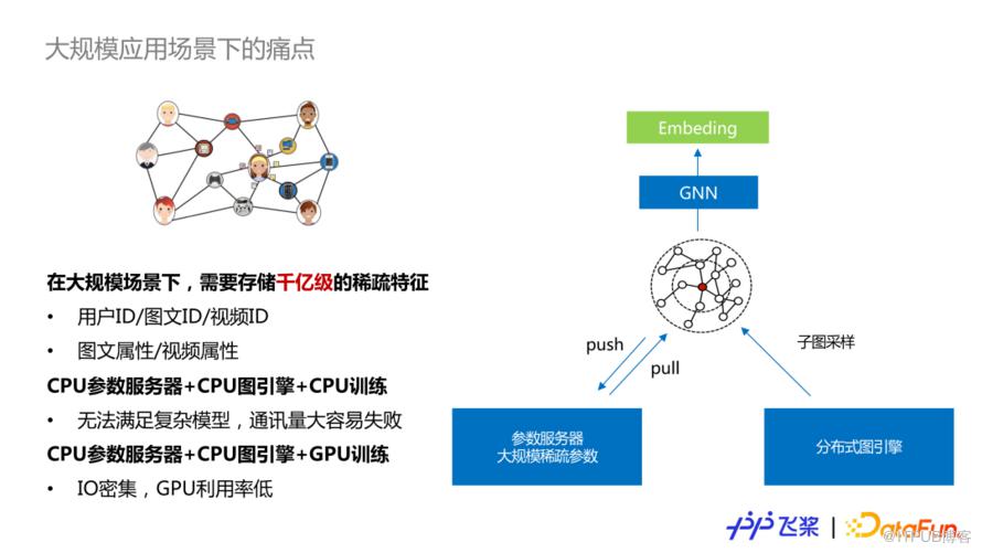 其次就是当我们的图采样邻居特别多的时候,拉取 embedding 以及图的采样的情况下,它通讯量很大。我们也经常会发现,例如我们搞 20 台机器去训练的时候,只要有一台通讯被打挂了,这个训练就很容易失败。有人也可能会说就是能不能用 CPU 参数服务器加图引擎,去配合 GPU 去训练,满足刚刚说到的一些复杂模型的需求。但是我们也会发现 IO 是很密集的,就是一些参数服务器的通讯,也是会导致整体的 GPU 利用率很低。5. PGLBox:全流程 GPU 化的大规模图学习引擎