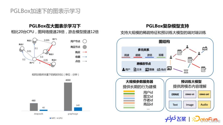 有了这么一个 PGLBox 的大图的表示学习的框架。我们在公司内也做了很多业务的升级。包括像原来有些 Deepwalk 模型,可能是 480 分钟能做完的,现在已经可以一个小时内就解决了。更复杂的模型,像 GraphSAGE 这种的就是会随着我们采样的邻居个数,导致计算量指数上涨的,在子图结构的指数上涨的同时,特征的拉取以及通信量也是在指数上升的。在 GPU 这种单机 8 卡的情况下,就基本上能把这些通讯给优化掉,像这种复杂的 GraphSAGE 一样的图网络,也能去做到 28 倍的提速。除此之外也是顺应时代潮流,我们通过这种全局 GPU 化能做到一些复杂模型的支持,像我们应用场景里面可能有不同的一些复杂关系,我们的节点本身是多模态的,里面可能有用户、文本和图像,大规模的参数服务器是提供了一些长期行为 ID 的建模,预训练模型就提供了这些跨模态内容的理解。因为有了这种 GPU 计算的图架构,我们就可以把以往预训练的大模型去跟这些大规模参数服务器放在同一套框架下面训起来,做一个端对端的学习,包括同时去调节预训练大模型里面的一些参数以及大规模的基于 ID 的一些参数服务器。通过目前这套 PGLBox 的框架,我们实现了单机 8 卡百亿级规模图表示学习训练,相比 CPU 分布式方案提升 28 倍。