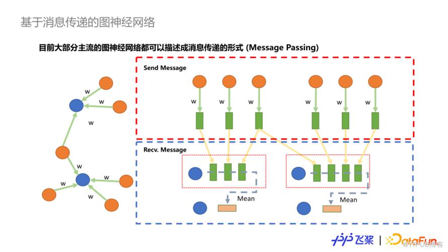 目前主流的图神经网络基本都可以描述成这种叫做消息传递的形式,即 Message Passing。像 DGL 还有 PYG 这些目前比较热门的图神经网络框架,包括我们的 PGL 也是沿用这样基于消息传递的范式去定义图神经网络。这里的 Message Passing 就是说我们只需要建模邻居是怎么把的消息从源节点发送到一个目标节点,以及目标节点获取到源节点的消息之后怎么做,例如做一个加权的求和或者是做一个均值。通过这样的一个框架,我们目前基本上能实现大部分的图神经网络,也甚至包括现在的 Transformer,假设把 Transformer 理解成一个全连接的图神经网络,其实 Transformer 的结构也是可以通过这种消息传递形式去实现。