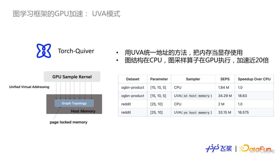 他们具体的做法就是把 GPU 的图结构存到锁页内存里,通过一种叫做统一地址的 Unified Virtual Addressing 技术,把内存当显存,使用 GPU 采样的 Kernel 就可以直接访问统一的一个地址。他们给出了一组数据,就是当用 UVA 的情况下做采样,会相比纯 CPU 的接近快 20 倍的速度。